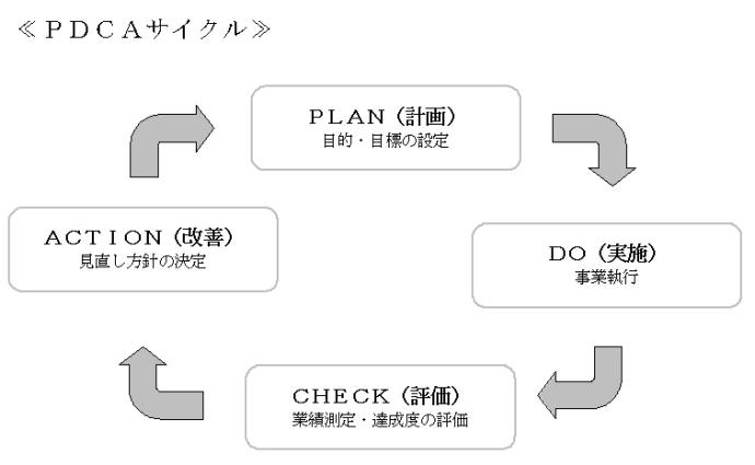 下図のように「計画(PLAN)→実施(DO)→評価(CHECK)→改善(ACTION)」のPDCAサイクルを基盤にして実施しています。このサイクルを行政運営に組み入れることによって、評価の結果を今後の事業の改善に結びつけていきます。